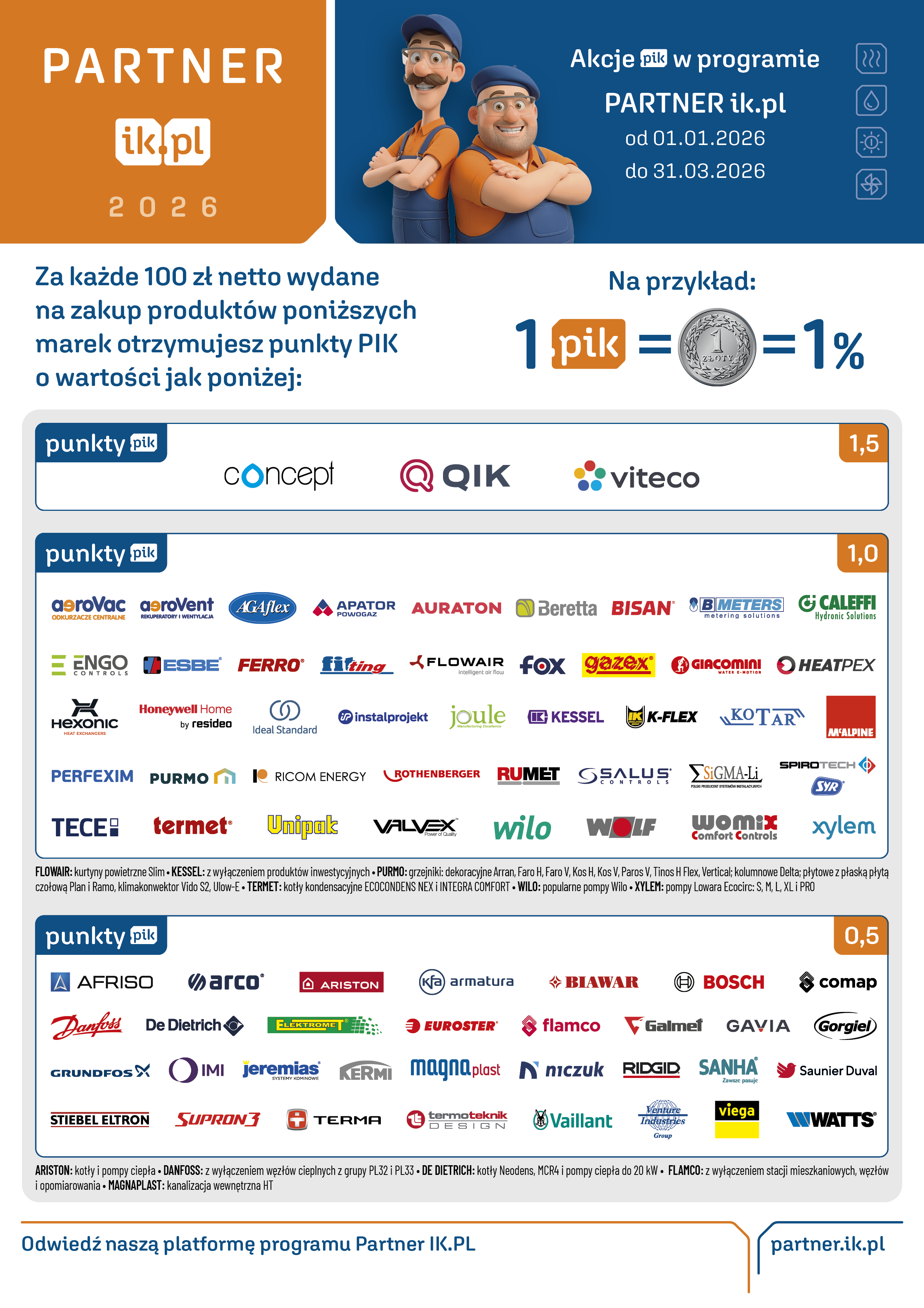 Najwięcej punktów otrzymasz przy zakupach produktów Marek Własnych Instal-Konsorcjum: Concept, QIK i Viteco, gdzie obowiązuje przelicznik 1,5 PIK za każde 100 zł netto. Pozostałe produkty naliczane są według listy akcji dostępnej poniżej.